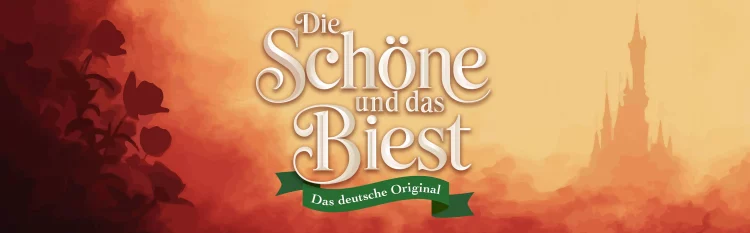 Titelbanner mit dem Schriftzug ‚Die Schöne und das Biest‘ und dem Zusatz ‚Das deutsche Original‘ vor einem orangefarbenen Himmel und einer Schloss-Silhouette. Banner