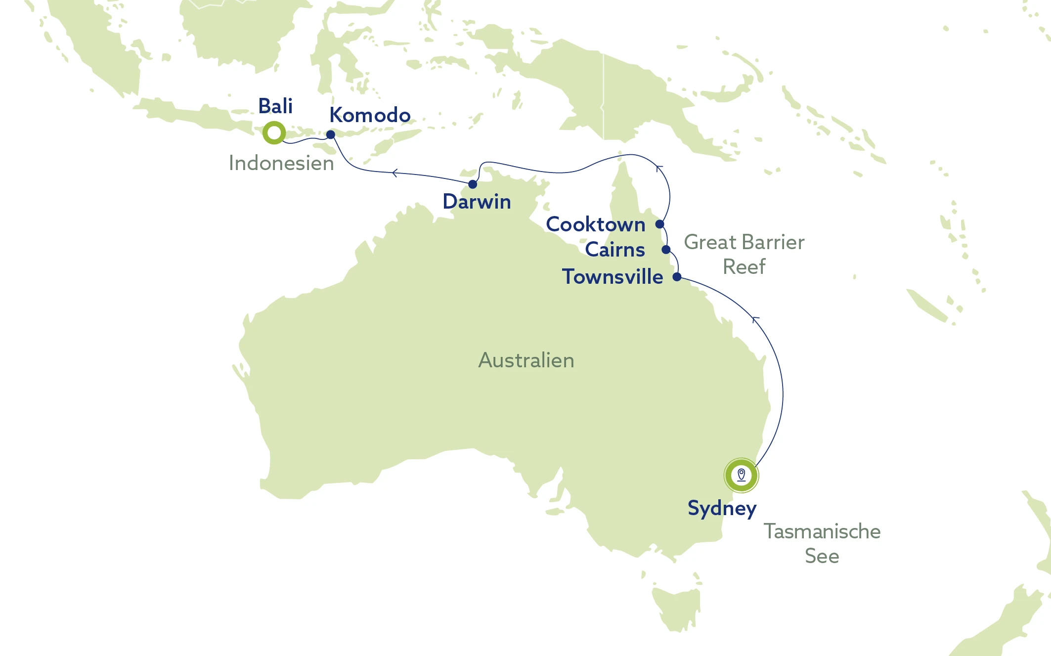Sydney • Townsville • Cairns • Darwin • Komodo • Bali