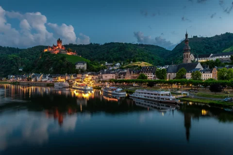 Eingebettet in die romantische Flusslandschaft des Moseltals liegt das kleine Städtchen Cochem mit seiner traditionsreichen Geschichte von den römischen Wurzeln, über die Zeit im Mittelalter bis hin zur Gegenwart. Zahlreiche gut erhaltene Reste der Stadtmauer sowie von Stadttoren zeugen von der belebten Vergangenheit, der Marktplatz mit dem Rathaus ist ein wahrer Blickfang und die verwinkelte Altstadt lädt zu einem Bummel oder einem Glas Moselwein ein. Einen beeindruckenden Anblick bietet die Reichsburg – sie thront auf einem steilen Bergkegel 100 Meter über der Mosel. Besonders in der Adventszeit bezaubert die Altstadt mit liebevoll geschmückten Gassen, Lichterglanz und festlicher Atmosphäre. Der Weihnachtsmarkt vor der Kulisse der Reichsburg verleiht Cochem einen märchenhaften Charakter – perfekt, um sich auf den Heiligen Abend einzustimmen.